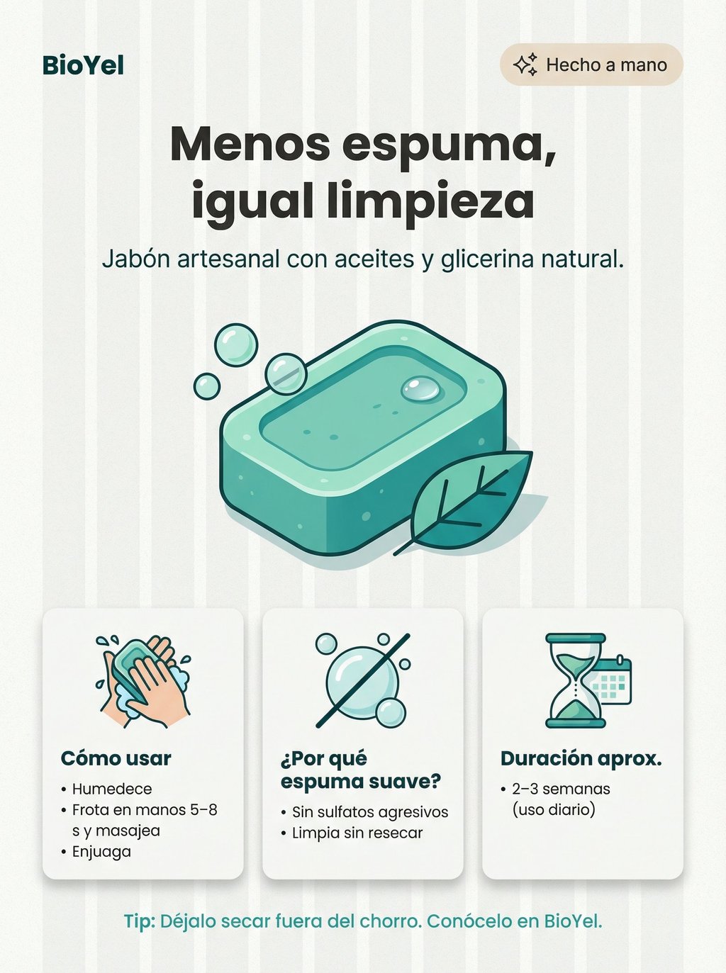 Creamos jabones, shampoos y acondicionadores sólidos a mano, eligiendo cada ingrediente por lo que aporta a tu experiencia diaria, no por moda ni exceso innecesario.